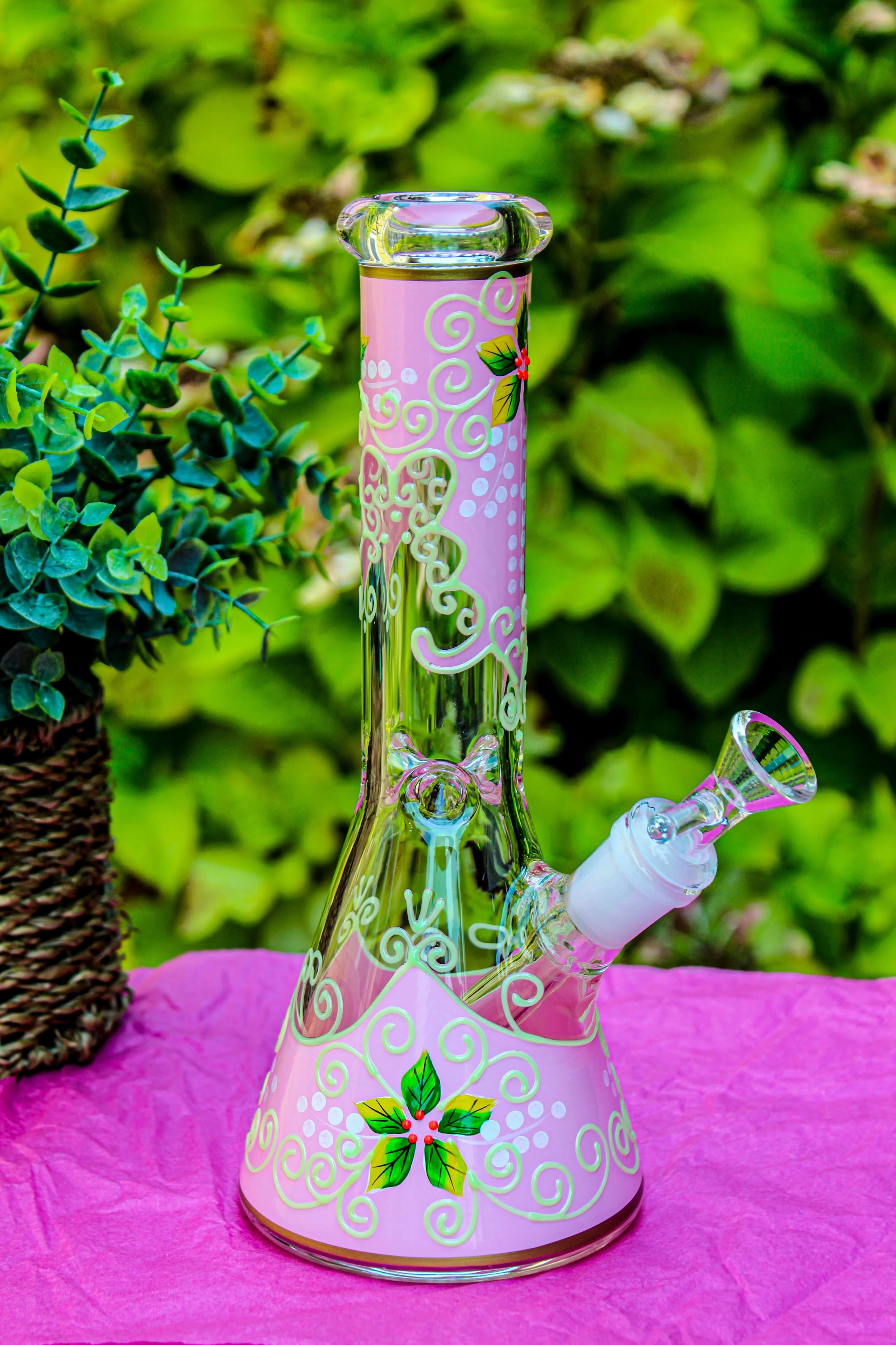 The all NEW Enchanted Florist GLOW Bong is 10" tall and contains a highly-colorful floral design throughout the entire piece that GLOWS when the lights go down. These top-tier bongs are blown with thick 5mm glass and contain GOLD-TRIM along the base and mouthpiece!