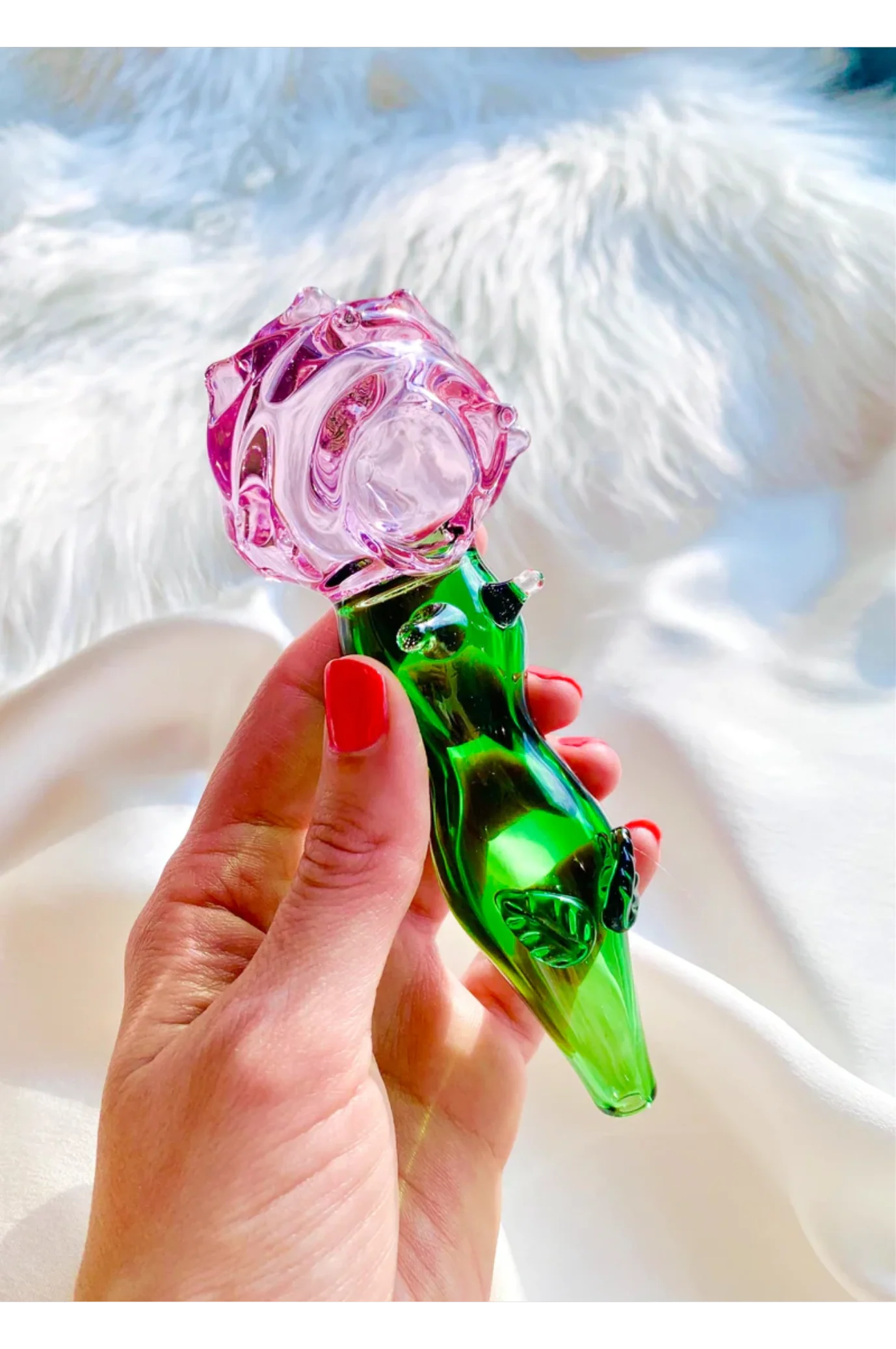 These highly-colorful Rose Pipes are 5 inches long and glisten with color! Every piece contains highly-detailed rose petals surrounding a deep bowl and a translucent-green stem that contains detailed leaves and two glass thorns.